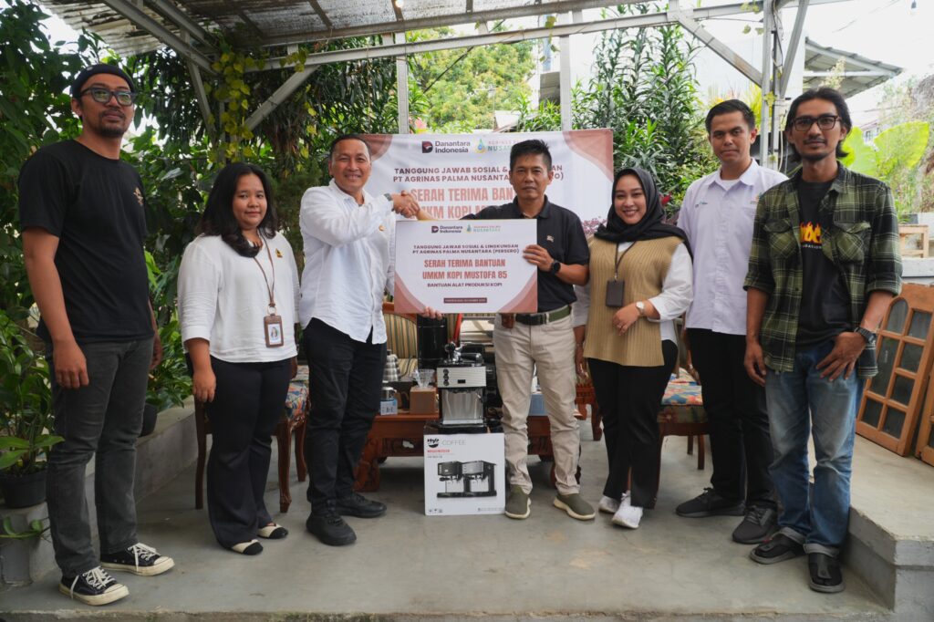 Pada kesempatan tersebut, PT Agrinas Palma Nusantara (Persero) menyerahkan satu set mesin kopi kepada Warkop Mustafa 85. Hadir dari Divisi TJSL dan ESG PT Agrinas Palma Nusantara (Persero) Manager Perencanaan, Pengukuran, Monitoring, dan Evaluasi, Amilia Fahma Kusumawardani, Manager Lingkungan dan ESG Indrajid Putra Bimantoro, serta staf Subdivisi Lingkungan dan ESG Anisah Zhafirah Siregar.