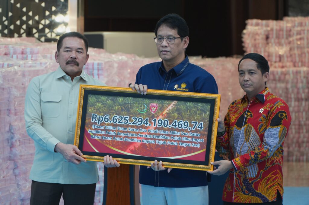 Jaksa Agung ST Burhanudin menyerahkan secara simbolis kepada Menteri Keuangan Purbaya Yudhi Sadewa dilanjutkan kepada Kepala Badan Pengelola Investasi (BPI) Danantara, Rosan Perkasa Roeslani, kemudian diberikan kepada Direktur Utama PT Agrinas Palma Nusantara (Persero) Jenderal TNI Purn. Agus Sutomo.