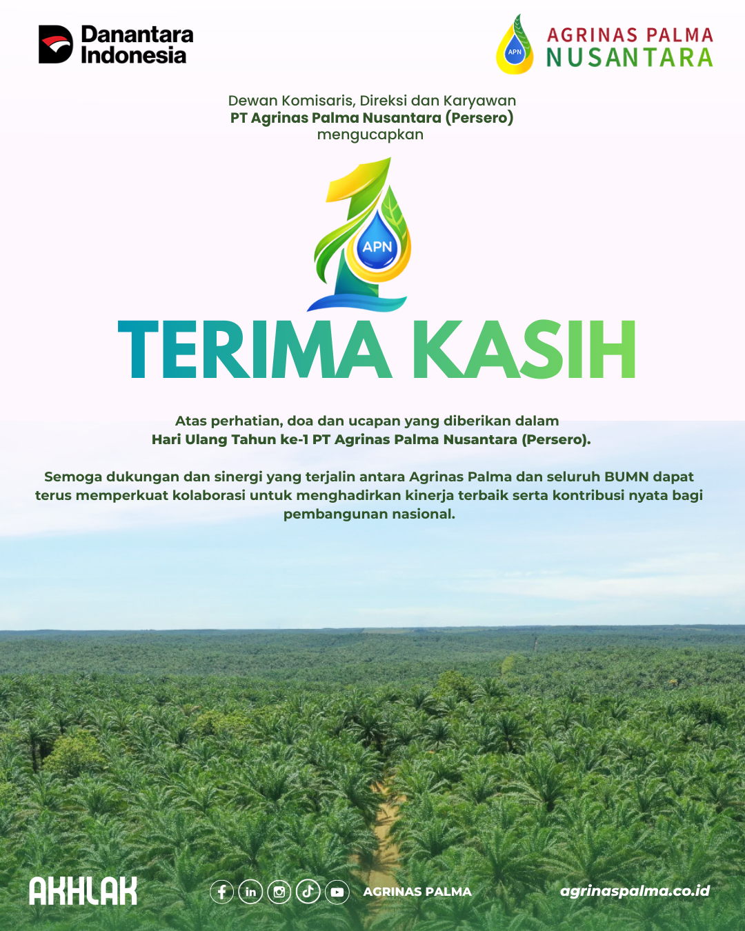 Mengusung semangat “Dalam Ulang Tahun ke-1 ini, Agrinas Palma Nusantara berkomitmen untuk mewujudkan swasembada energi”, Agrinas Palma terus memperkuat transformasi bisnis dan tata kelola perusahaan guna menghadirkan kontribusi nyata bagi kemandirian energi Indonesia.