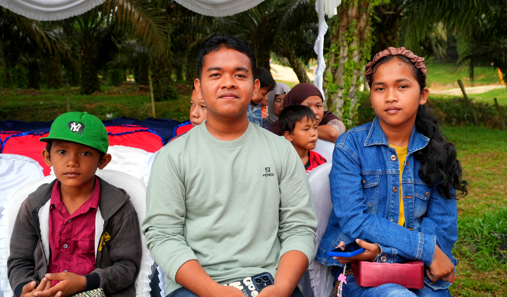 David Erikson dan Hotmaria Silitonga, tampak bahagia menerima bingkisan dari Agrinas Palma Nusantara. “Saya tidak menyangka, kemarin cuma dibilang supaya hadir dalam peringatan ulang tahun pertama,” kata David, 14 tahun, siswa kelas 8, SMPN Cerenti 1.